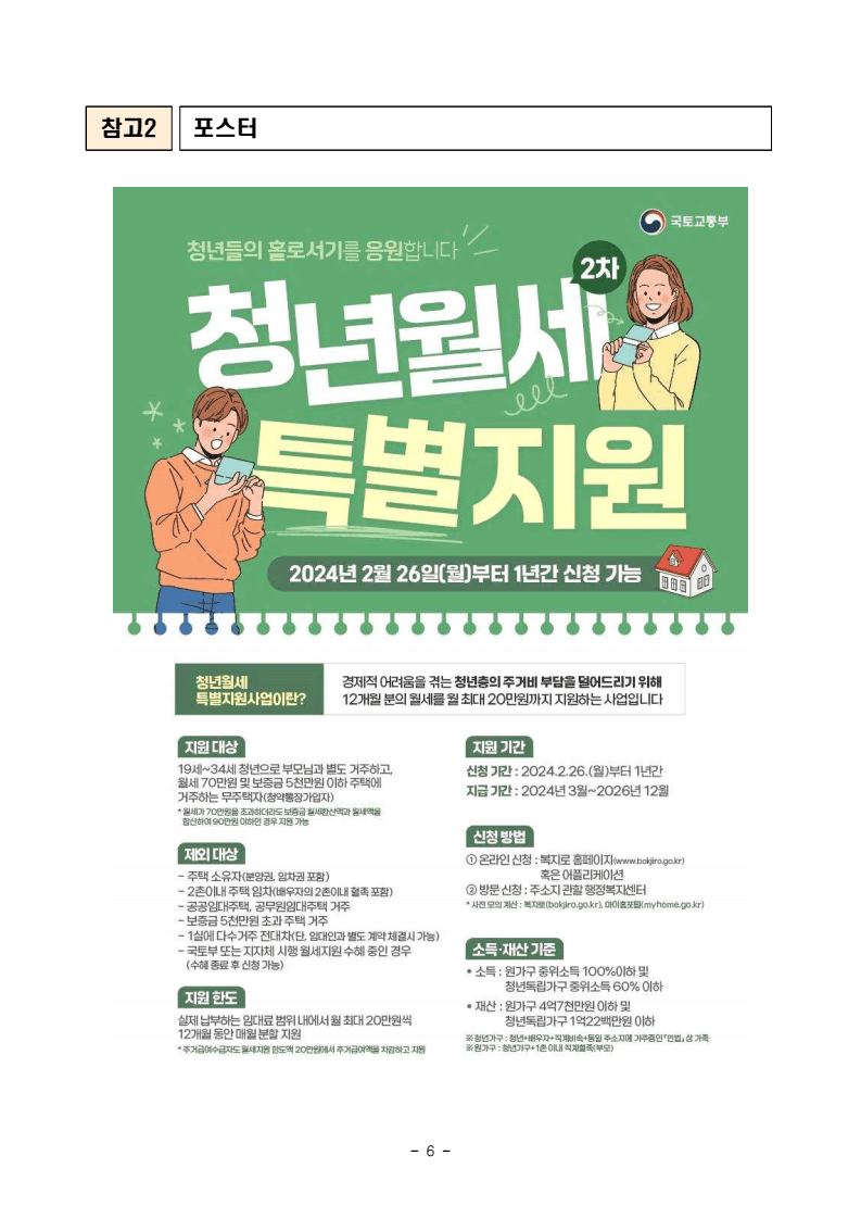 □ 국토교통부는 청년들의 주거비 부담 완화를 위해 월 최대 20만원씩 12개월 분의 월세를 지원하는 “청년월세 특별지원” 2차 사업 신청을 2월 26일(월)부터 한다고 합니다.